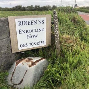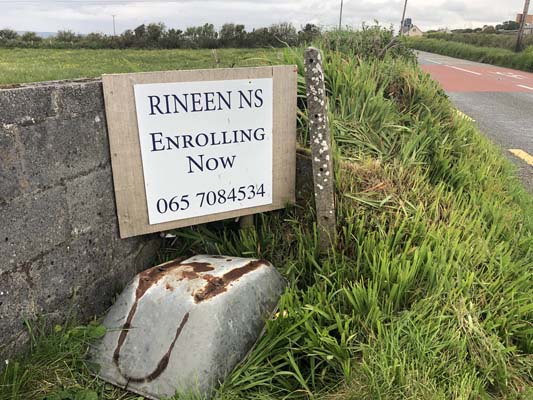 Before Rineen NS was built in 1869 some children from the surrounding area, I believe according to the most attractive and handsome volume Rineen Rememberswere educated in Hedge Schools. How amazing it is to think that this building takes us back to that era of our history. Roll number 9435 (echoes of Jean Val Jean in Les Miserables). Rineen in the parish of Kilmannaheen, in the Barony of Cormomroe, the place name as Gaeilge “Rinnín”meaning “Small Point” beside the Rineen River which gives rise to Tor Hill. I am fascinated with the fact that because the river forms the boundary with the parish of Kilfarboy in the barony of Ibrickane, the school being on the Rineen side of the boundary is in the parish of Kilfarboy. However, though built in the Galway Diocese Rineen is under the Patronage of the Killaloe Diocese. I’m thinking the ambush of 1920 was not the only ambush that might have happened here! I know Bishop Fogarty who was bishop of Killaloe at the time of the ambush had his own run ins with the Crown Forcesand was well capable of standing his ground and even ambushing if necessary!