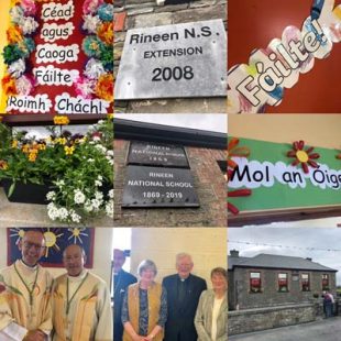 Fáilte chroíúil roimh ’chuile dhuine anseo inniu, idir chléir agus tuath. I welcome you all as we celebrate the 150thAnniversary of Rineen National School. Welcome to all, clergy, past and present, members of the Board of Management, to the teachers, pupils, to past pupils, to those who have travelled long distances to celebrate this occasion. Education in this area has a long and established tradition. Go deimhin tá stair agus tradisiúin fhada ag an scoil seo. Céad caoga bliain ó bunaíodh í, bail ó Dhia uirthi.