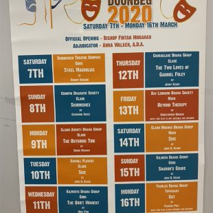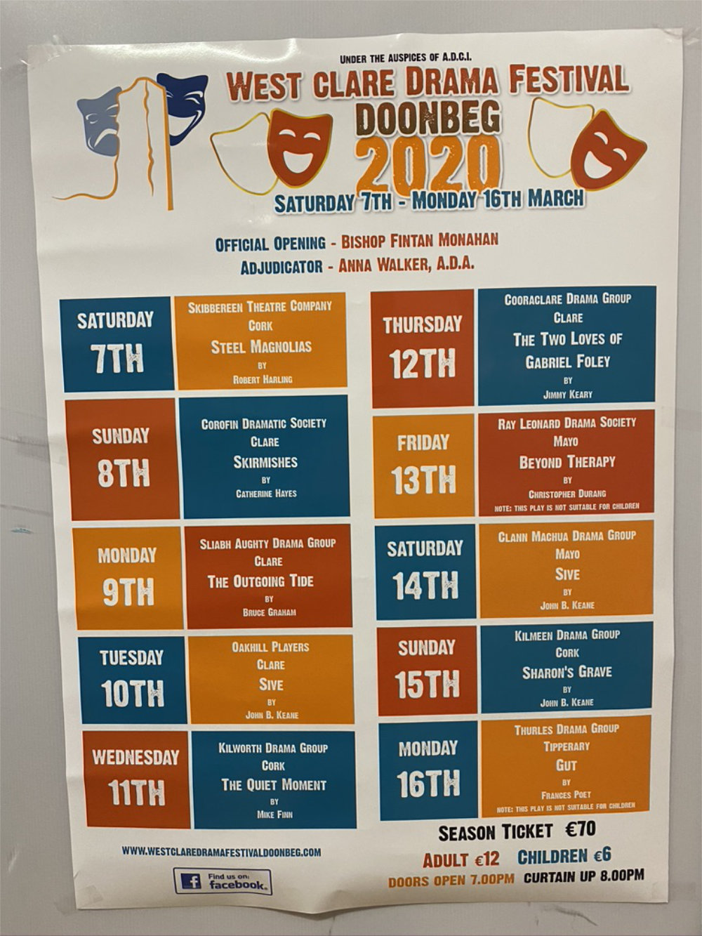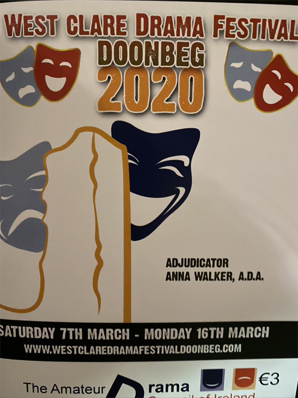 I am confident that this 10 days of theatre will live up to those high standards long expected and constantly delivered by the West Clare Drama Festival. Best of luck to all the wonderful organising committee, to all the drama groups taking part, to the adjudicator, Anna Walker and most of all every good wish and enjoyment to you the punters, the theatre goers who are here tonight to be entertained and edified in the sublime art that is theatre and drama at its very best.