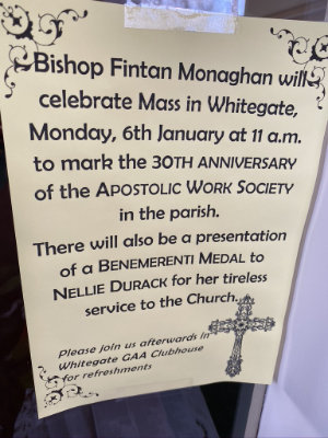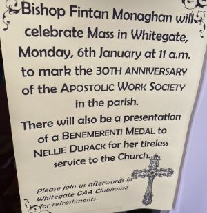 Congrats to Nellie Durack who received a Bene Merenti Medal for outstanding and dedicated service and Maisie O’Rourke whose work was recognised as a founder member of the Whitegate Apostolic Work Society in Killaloe Diocese on Monday, January 6th at a special ceremony in the Church there. Many family members along with parishioners, school children from Lakyle NS and various other Apostolic Work Societies were in attendance.