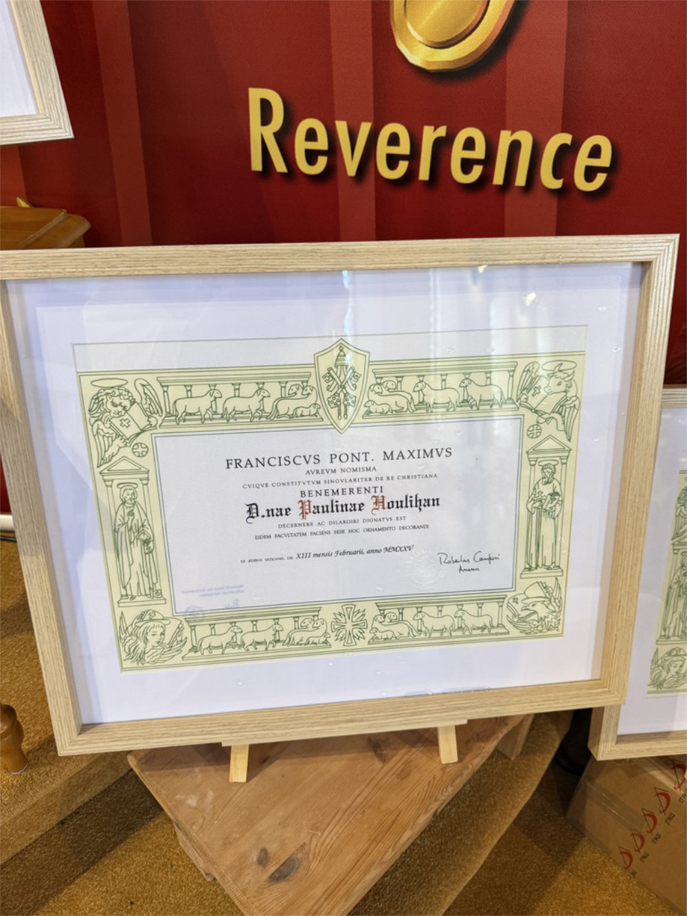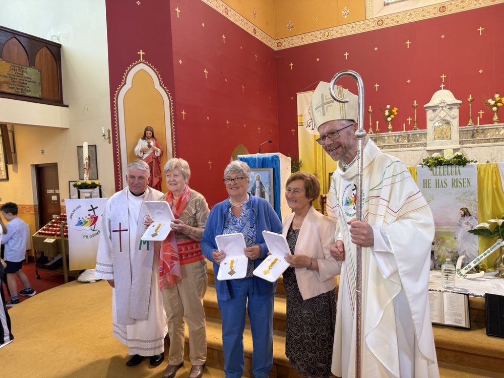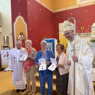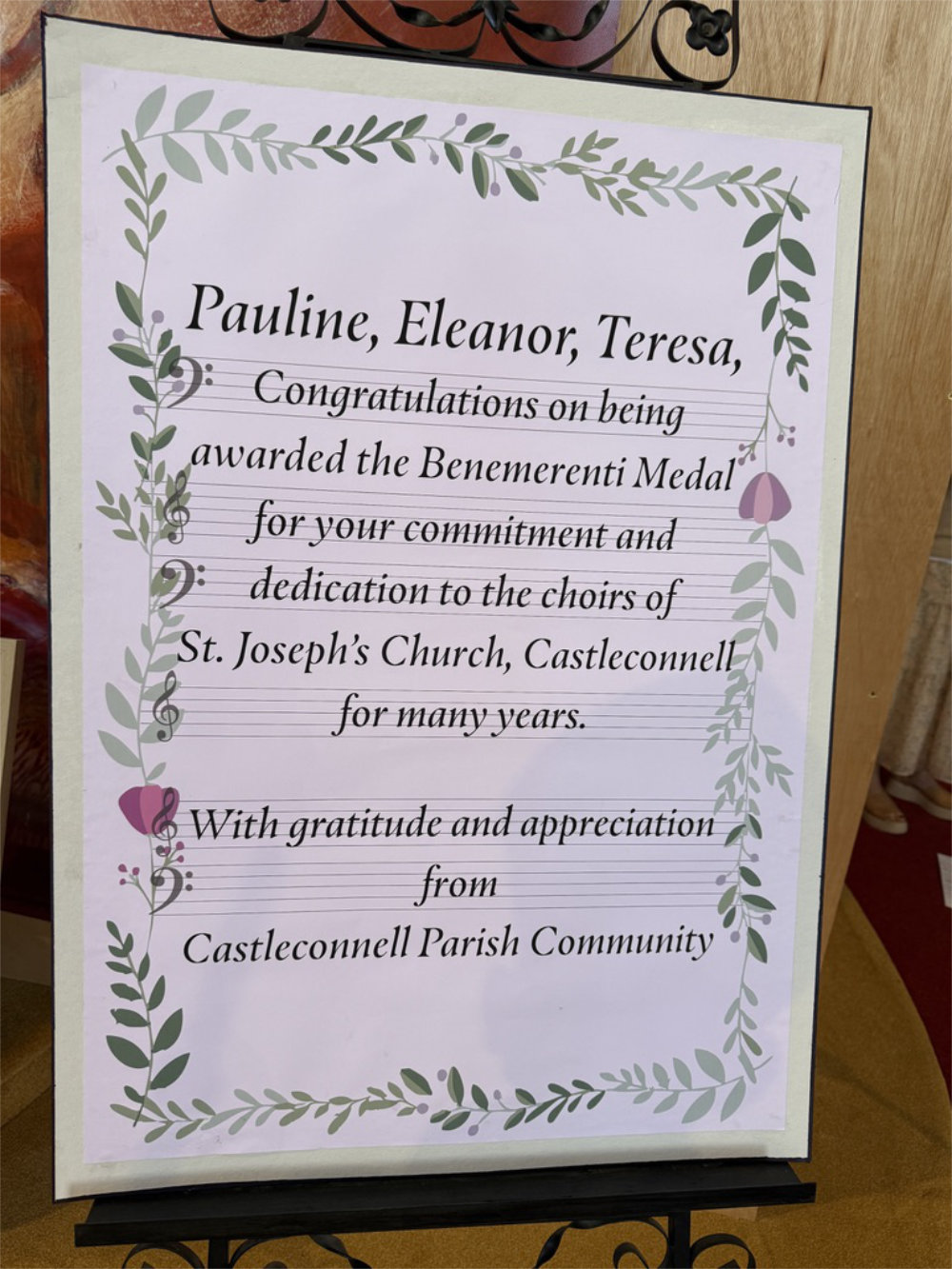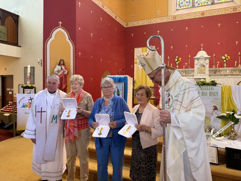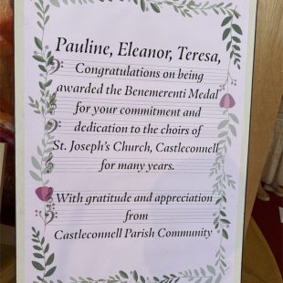 Congratulations to Pauline Houlihan, Teresa Jones and Eleanor Kingston who were presented with Benemerenti Medals for lifelong service to the Church in Castleconnell, Co. Limerick. Thanks to Fr. Willie Teehan, pastoral minister Dolores Madden and all in St. Joseph’s Church who assisted them on the day.