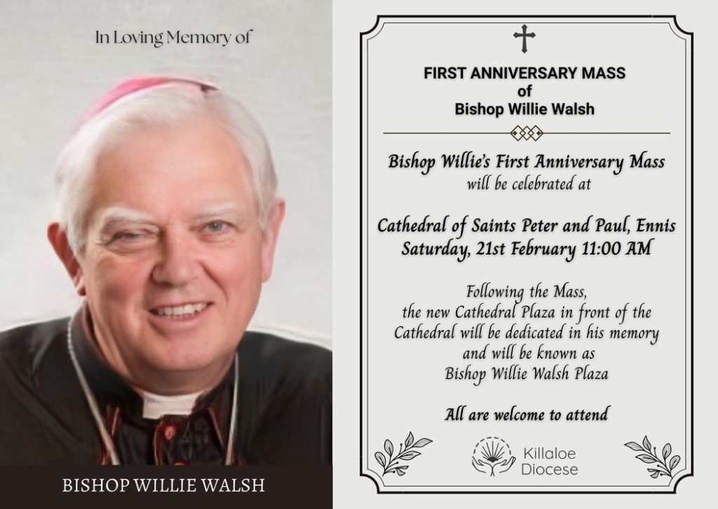 - Following the celebration of this Anniversary Mass, the new Cathedral Plaza in front of the Cathedral of Saints Peter and Paul, in Ennis, will be dedicated to the memory of the late Bishop Walsh, and it will be known as ‘Bishop Willie Walsh Plaza’.