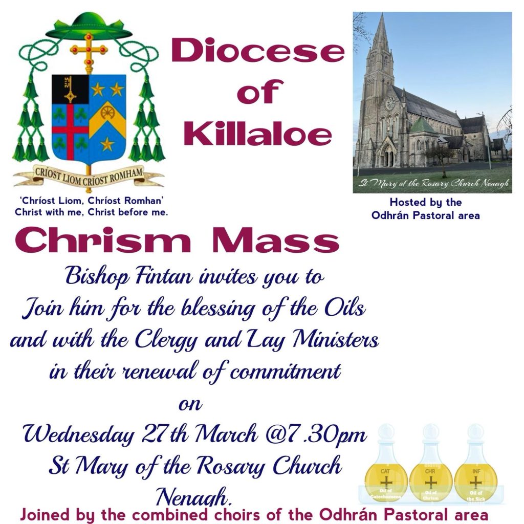You are warmly invited to participate in the Chrism Mass this year in St. Mary of the Rosary Church, Nenagh on Wednesday of Holy Week at 7.30 pm.