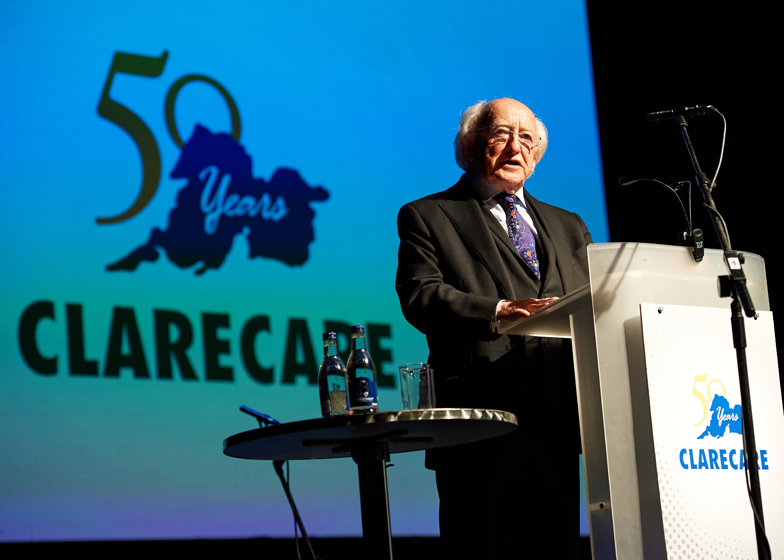 A Uachtarán Michéal agus do bhean chéile uasal Sabina,is mór an phléisiúr dom agus cuireann sé áthas an domhan orm, mar Chathaoirleach ar Bhord Clarecare, agus ar son baill an bhoird fáilte Uí Cheallaigh a chur romhaibh inniu ag an ceiliúradh órga seo, leath-chéad bliain ó bunaíodh an eagraíocht shuntasach seo.