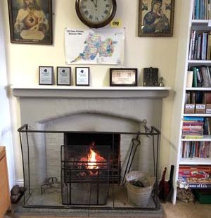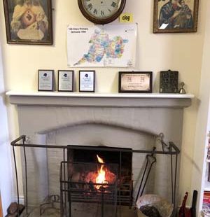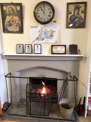 One of the things that really caught my eye was the retention of the original fireplace in the senior classroom, a great memory of the original building and as they say a relic of oul dacency(!). There is something very special around the glow of a turf fire and the warmth of welcome around a hearth. What a beautiful photo of the students gathered around it playing trad music and warming themselves around the fire and this is so beautifully reflected in the Article on page 32 of the magazine aptly entitled “School is where the hearth is”.