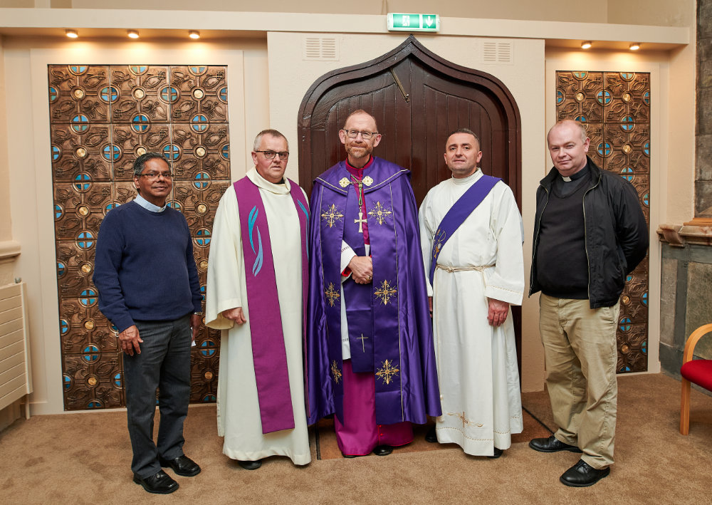 - Bishop of Killaloe Fintan Monahan uses oil of Chrism at the consecration of the columbarium at The Cathedral of Saints Peter & Paul, in Ennis. Looking on is Deacon Antun Pasalic who will be ordained as a priest next year. Photograph by John Kelly