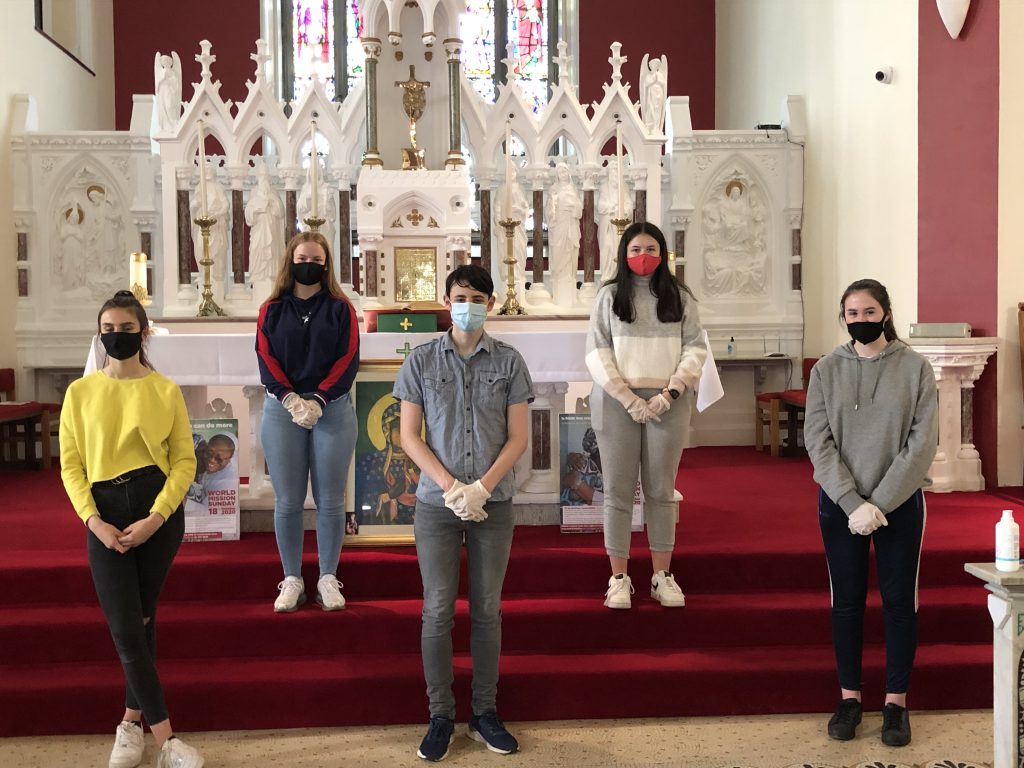 A group of five Transition Students from St. Brendan’s Community School, Birr are participating in the Pope John Paul 11 Awards. As part of their parish work, they were helping with ushering at Sunday Mass and sanatising afterwards.