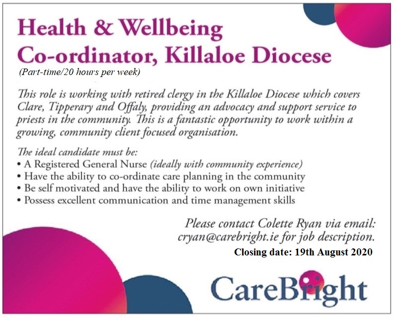 Please see the application below for a position of Health and Welfore Coordinator for Senior Clergy in the Diocese of Killaloe. Application process and information through Carebright only.