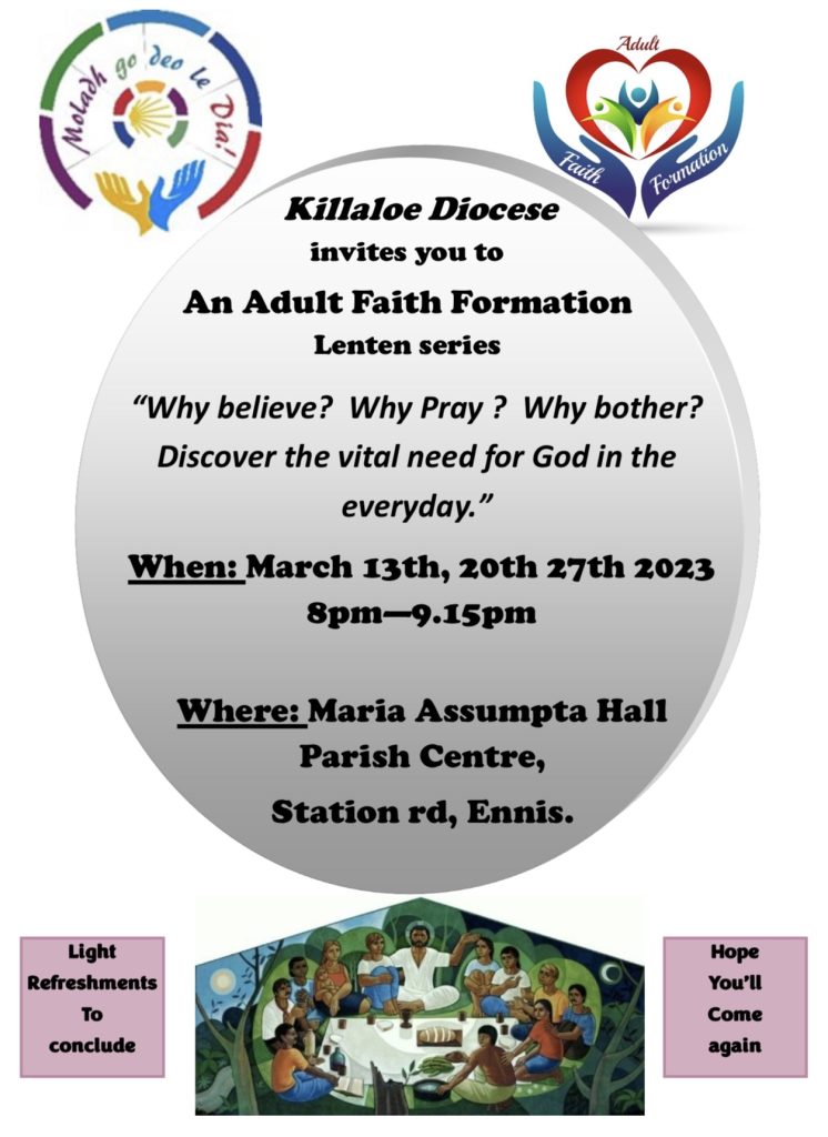 Our New Ministers of Adult Faith Formation cordially invite you to join them for a Lenten Series on Prayer in the Parish Centre, Ennis during Lent, details below. All welcome.