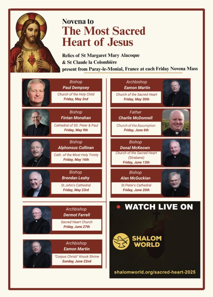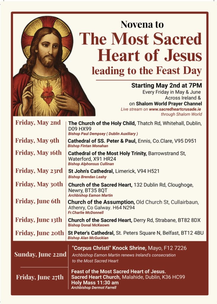 Whether you can attend in person or join from home, each novena day will be livestreamedon www.sacredheartcrusade.ie. For more information please visit Shalom World here
