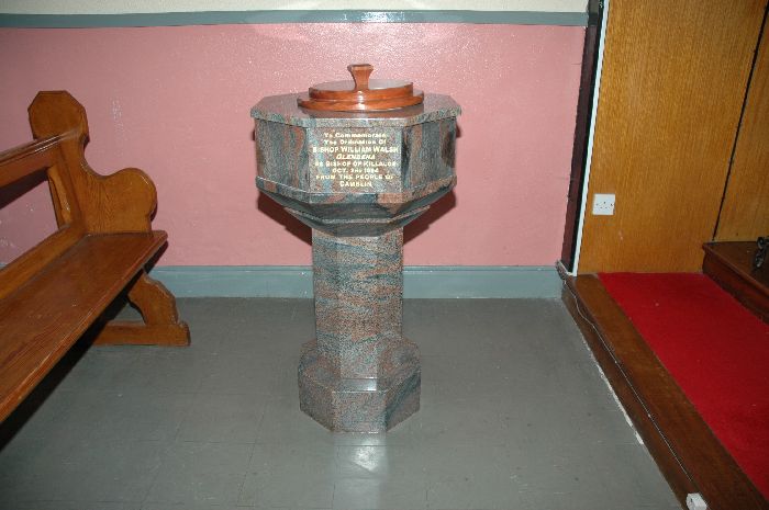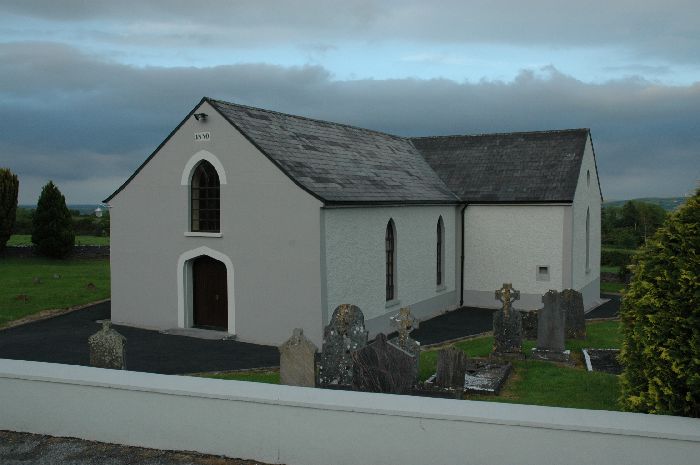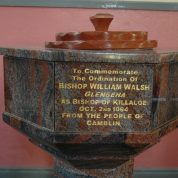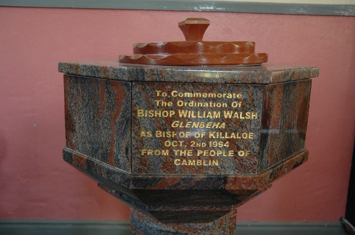 The Church of St. John the Baptist at Camblin was built either in the last years of the eighteen century or the very early years of the nineteenth. At that time Camblin was in the Corbally part of Corbally and Bournea parish, before the major boundary change of 1846 which saw it transferred to Roscrea. In the 1970’s major renovations were carried out which made Camblin Church a fitting place of worship. In 1994 the installation of Bishop Willie Walsh, a native of Glenbeha, Camblin, was marked by the presentation by local people of a marble baptismal font to the church. In 2009 some perimeter wall was added and the cemetery increased in size.