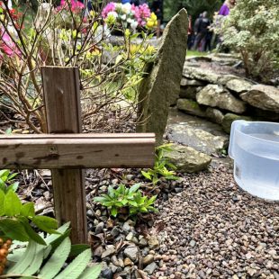 “Some special traditions attached to this place; water from the holy well was used for sprinkling and blessing the land, and water from the little ‘eye well’ beside it was believed to have curative properties, particularly for diseases of the eyes. It was also said by some people that the water from the eye well would never boil. Beside the holy well there is a may tree where people leave rags, rosary beads, medals, and even hair grips, as offerings when they visited the well. The impulse to do this arises from the sense that you have to give something to get something – a sign of the prayers. Everyone who has prayed here has left something behind; not necessarily any material thing, but an atmosphere that can be sensed.”