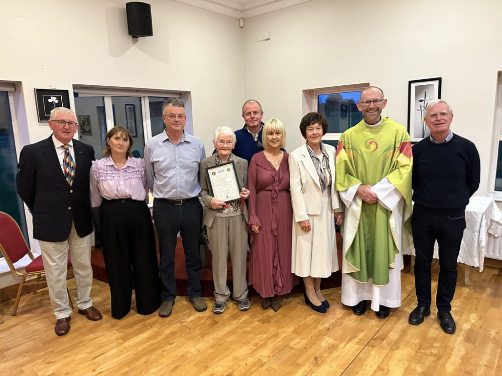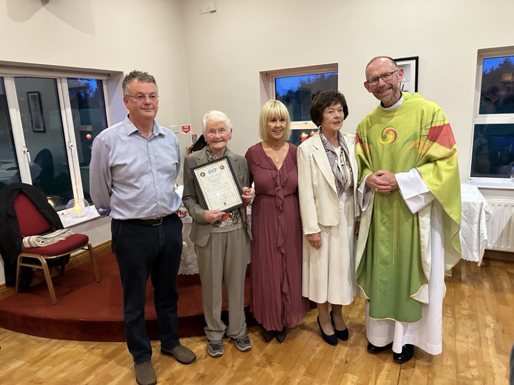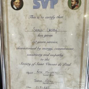 A half-century ago the St. Vincent de Paul Society was an all-male preserve, but at the invitation of Fr. Pat Sexton who was curate here at the time, Mary broke that mould and became the first lady member, raising the flag for ‘Mná na hÉireann’!