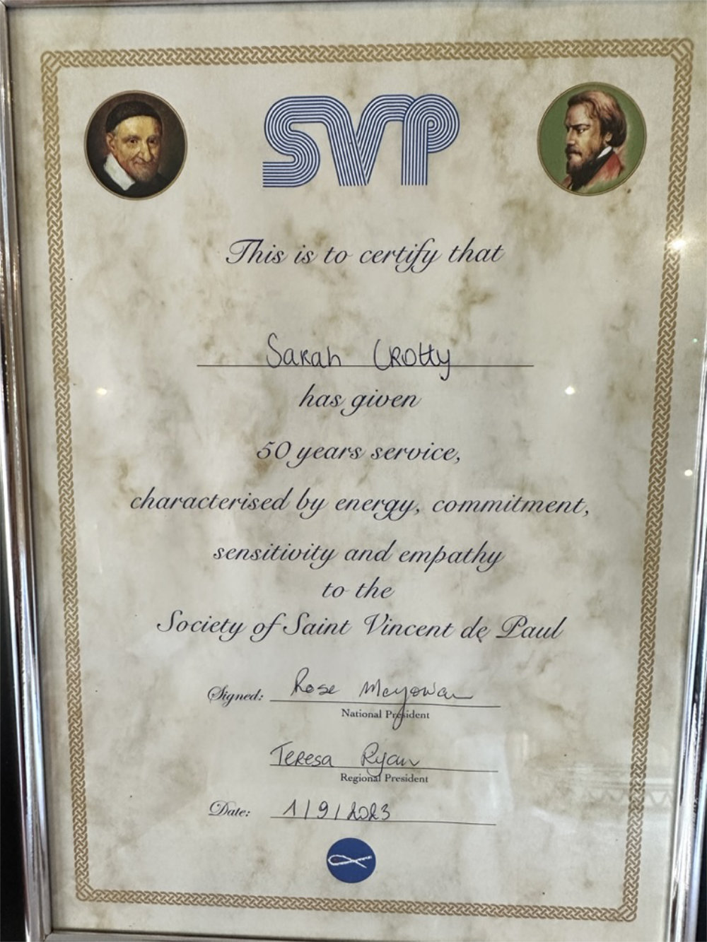Today, we gather to celebrate two remarkable people who have graced this parish with their boundless compassion, unwavering dedication, and a heart that beats for service. For an amazing over 50 years, Mary O’Dea and Sarah Crotty have been the shining light of St. Senan’s St. Vincent De Paul Society, embodying the spirit of selflessness and love for our fellow human beings.