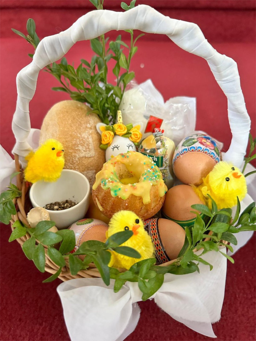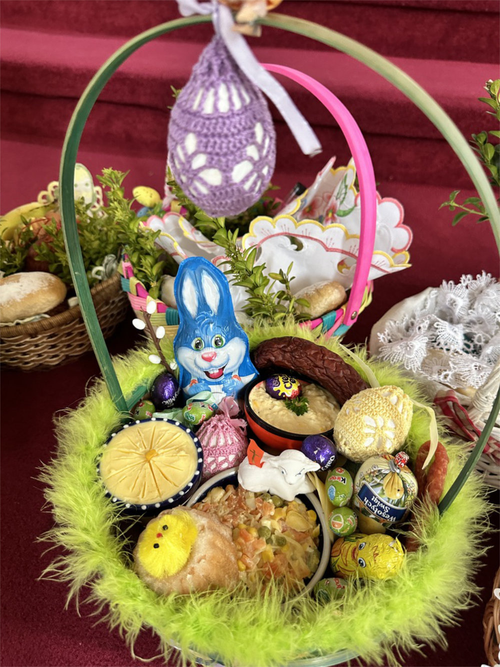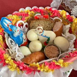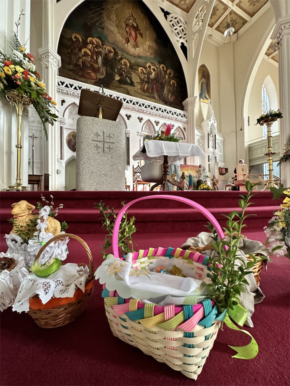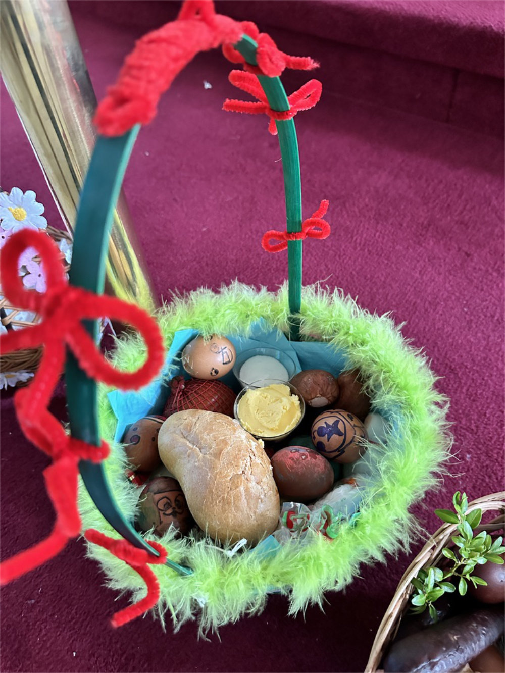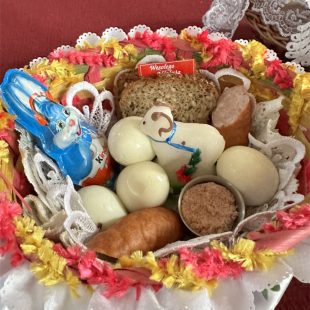 church to be blessed on Holy Saturday. The basket is traditionally lined with a