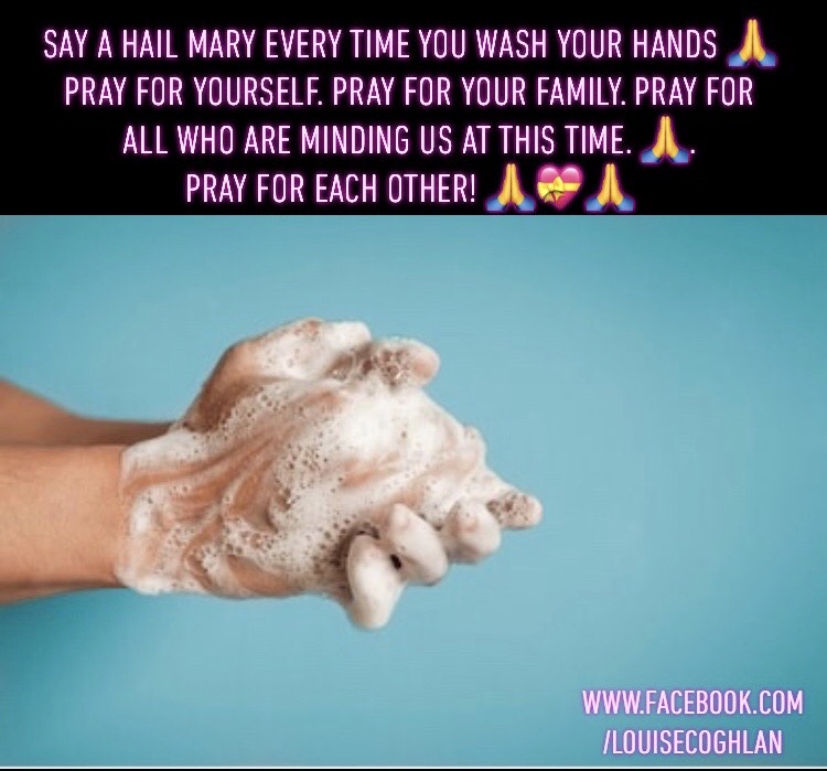 Louise’s idea of saying a Hail Mary or two when you wash your hands is an ideal opportunity to bring a little bit of faith back into the home and also back into your own life. She believes that it might help calm our nervous systems as well by getting into the habit of saying a little prayer while washing our hands and that no matter what, it can’t be a bad habit to start in such a worrying time. Also Louise mentioned that “by saying a prayer while you are washing your hands, it’s a win win. You are washing your hands to keep yourself safe and by saying a prayer you are doing good for someone else. There are lots of people who are very stressed, isolated and worried at the minute and to say a prayer for them is a really nice thing to do. Your first washing of your hands in the morning could be for the doctors of the country. The second time you wash your hands could be for nurses. The third time could be for people who have Covig 19 or who are worried that they have it. The fourth prayer could be for people who are lonely and isolated in their houses and so on for the whole day ahead. Children love a story behind an action. And children are amazing for creating love and kindness in this manner, the washing of your hands along with the prayer could be the structure to let their hearts bloom. A bit like show and tell with the added bonus of instilling a little faith, hope, love and kindness as well. Also for the little children, it adds a different dimension to washing their hands and it would be good for their brain and their emotions. Prayer is a meditative approach to repeating words that have such a lovely meaning behind them. And also it allows the child to attach something doubly positive to the habit of washing their hands. They are protecting themselves but they are also sending good energy and thoughts for someone else.”